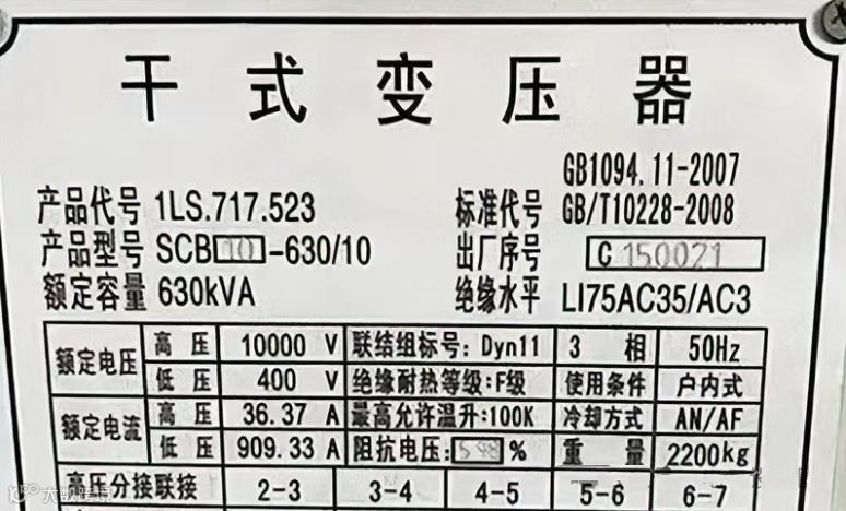 例如:下图是一台630kVA变压器的铭牌,