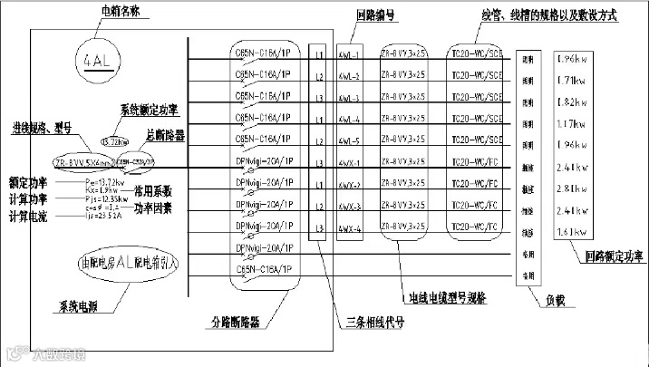 配电系统图的组成:一个系统图看似简单,其实一个系统图已经涵盖了很多的专业术语,这就是很多在座的设计师看不懂系统图的原因。它不是一个剖面图让你一目了然,也不是一个平面图让你随意布局,系统图的最大特点就是将每个构件和工艺用规范性的符号去代替,说到底要读懂系统图的必然因素就是能看懂符号,不懂符号无异于天书。它不会像节点图一样用中文标明这里是什么、怎么做,但它就是可以囊括一个配电系统的很多东西,表达出电气平面施工图表达不出来的东西。