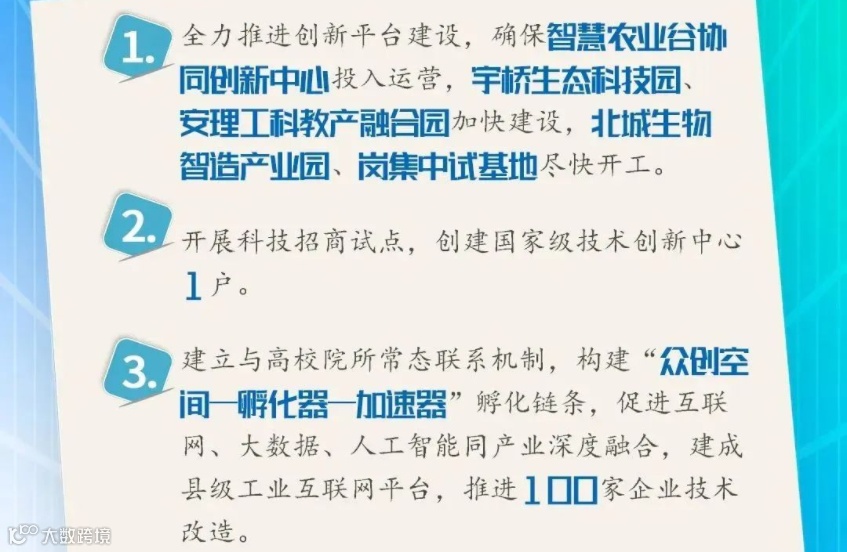 全力推进创新平台建设,确保智慧农业谷协同创新中心投入运营,宇桥生态科技园、安理工科教产融台园加快建设,北城生物智造产业园、岗集中试基地尽快开工;