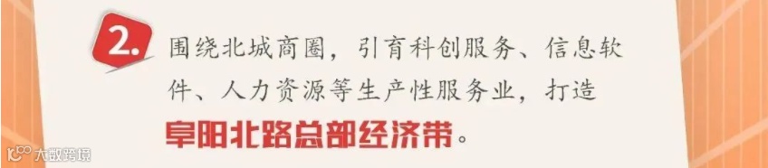 围绕北城商圈,引育科创服务、信息软件、人力资源等生产性服务业,打造阜阳北路总部经济带。