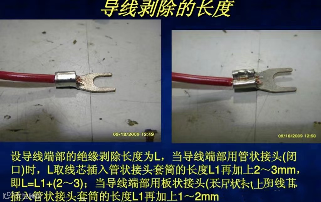 设导线端部的绝缘剥除长度为L,当导线端部用管状接头(闭口)时,L取线芯插入管状接头套筒的长度L1再加上2~3mm,即L=L1+(2~3);当导线端部用板状接头(开口)时,L取线芯插入管状接头套筒的长度L1再加上1~2mm,即L=L1+(1~2)。