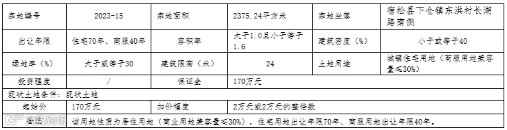四、本次挂牌出让的详细资料和具体要求,见挂牌出让文件。申请人可于2023年4月22日至2023年5月23日到宿松县自然资源和规划局开发利用股获取挂牌出让文件。