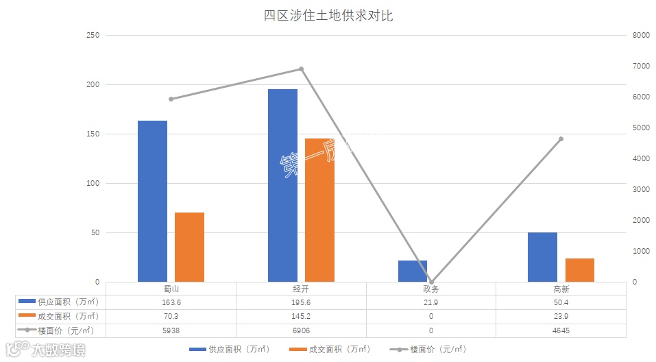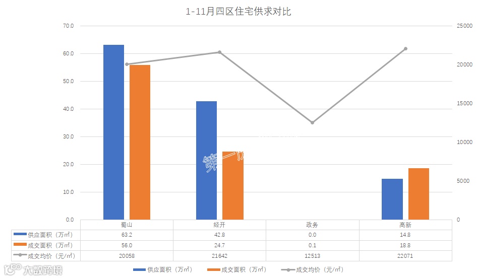 分区来看的话,四区涉住土地的供应量主要在蜀山和经开两区,而成交量价主要由经开区撑起,今年1-11月经开区成交了145.2万㎡,楼面价为6906元/㎡。