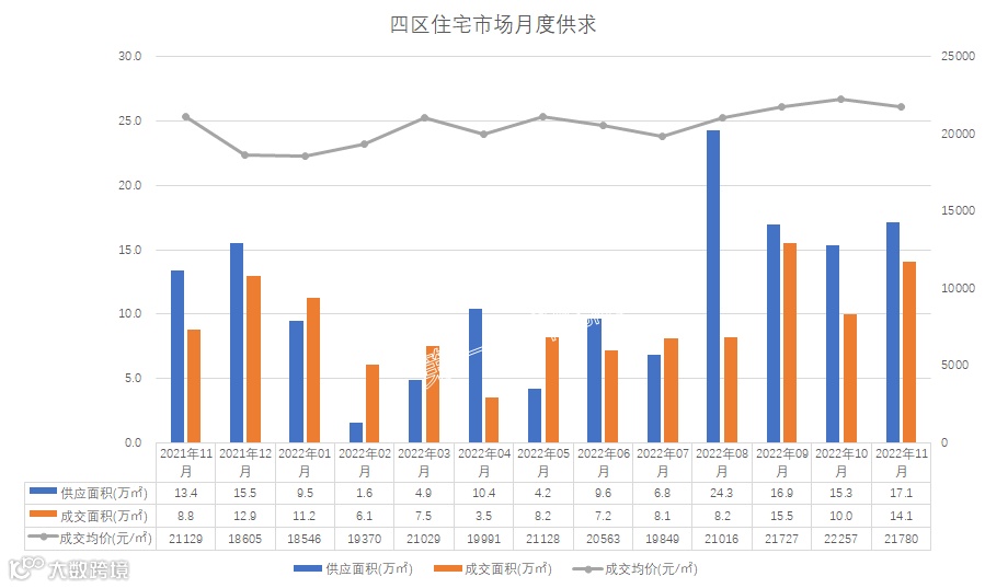 而今年1-11月累计供应120.8万㎡,累计成交99.6万㎡,成交均价20825元/㎡,与2021年市场同期相比,市场呈现一种量跌价涨的状态。