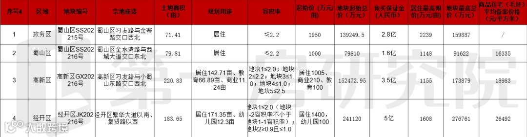 本次蜀山区、政务区、高新区以及经开区四区都各自出让了一宗地块,合计四宗地块,面积达到了555.7亩,且四宗地块都是涉住的商品房用地。