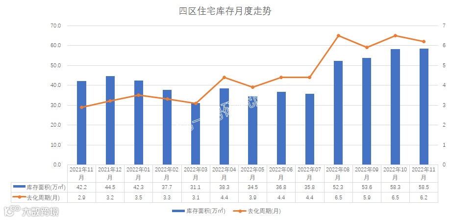 根据AI楼市数据显示,截止到11月份,四区住宅库存已达到58.5万㎡,去化周期为6.2个月。