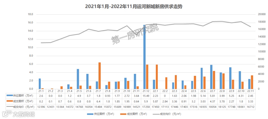 从2022年1月至2022年11月整体运河新城市场表现来看,运河新城月均供应在3.19万㎡,月均成交在2.46万平米,整体供大于求,成交均价16921元/㎡。随着二批次土地市场逐步转冷,传导至二级市场的结果就是客户观望情绪严重,新房市场逐月量价齐跌。