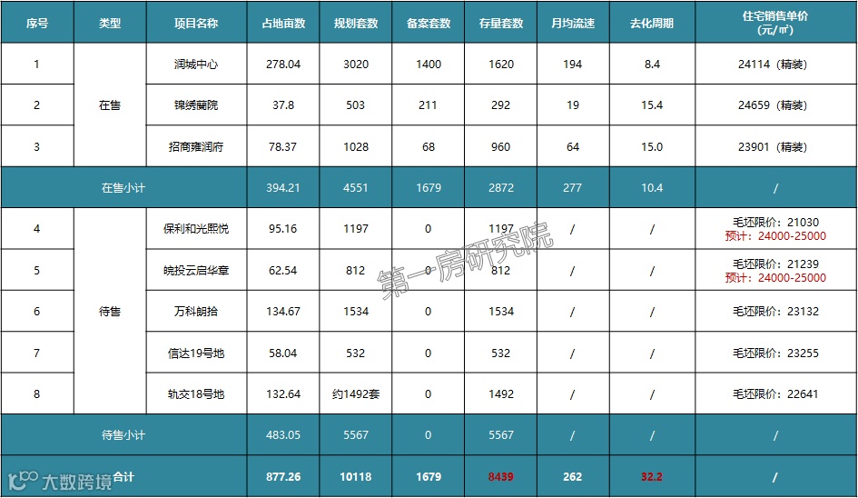 淝河板块目前在售及待售项目8个,其中3个在售盘,在售精装售价2.4-2.5万/平左右,其他5个均为待售楼盘,预计后期售价毛坯约2.3万/平米,精装约2.4-2.5万/平。润城中心开盘至今月均走量约194套(含开盘),锦绣蘭院开盘至今月均走量19套(含开盘),招商雍润府月均走量64套(含开盘)。保利和光熙悦目前已登记结束,触发摇号。同一板块流速冷热不均,后期待入市的新房主要也是以国央企开发为主,后期板块竞争预计会非常激烈。
