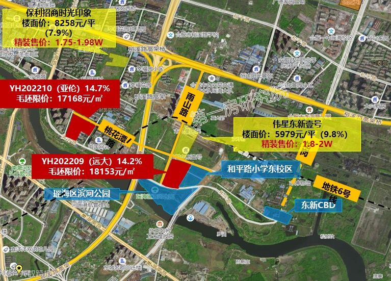东部新中心2022年累计出让土地4宗,成交4宗,2宗竞价成交。分批次来,一批次出让的2宗地块均是低溢价成交,尤其是伟星东新壹号项目,需要自持商业,因此在转挂牌时才有2家报名,可见当时东新土地市场热度一般。反观三批次出让的2宗地块,区位、地段都相差不大,但结果却相差甚大。3批次出让的2宗地块均是满分竞品质+摇号成交,土地市场正在发生蜕变。一批次地块出让时,东新板块处于拓荒期,板块内无倒挂,房企都较为谨慎。到三批次地块再出让时,二级市场热度传导至一级市场,土地市场大热。