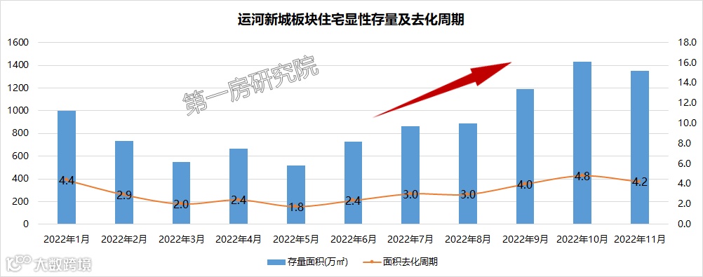 随着新房热度逐下降,运河新城板块显性存量逐月增加。截止2022年11月底,运河新城板块显性库存1349套,连续5个月走高。