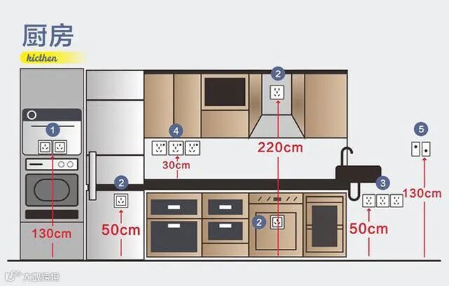 1、烤箱插座:烤箱后面安装两个带开关的16A三孔插座,高度与地面相距130cm,方便烤箱和微波炉等电器使用;