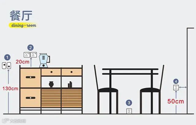 1、照明开关:餐厅安装双控开关,高度和地面相距130cm;