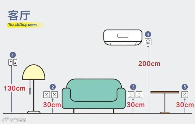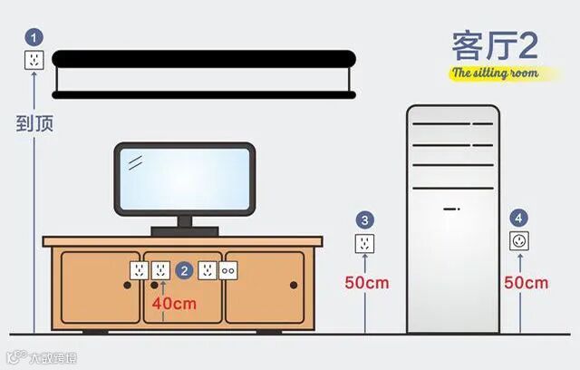 4、电视墙:至少安装3个五孔插座,一般安装在电视柜内部,高度与地面相距30cm,预留给电视以及周边的其他电器使用;