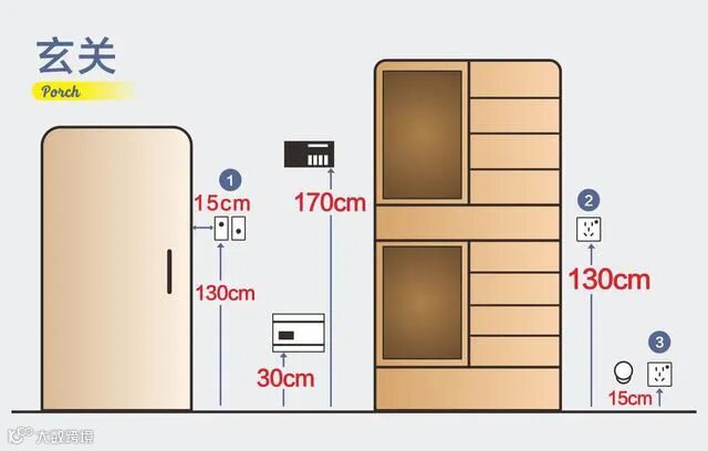 1、玄关开关:进门处安装双控开关,高度和地面相距130cm,距离门边15cm,控制玄关和客厅照明灯;