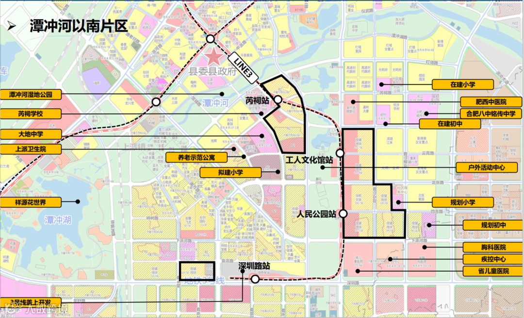 肥西潭冲河/滨湖西板块位于老城区以南,规划配套完善,居住环境优越,板块价值不断攀升,由于老城内部可开发空间有限、目前逐步重点向东南侧拓展开发,将各类配套重点引入潭冲湖板块;板块规划地铁3号线、5号线西延线。
