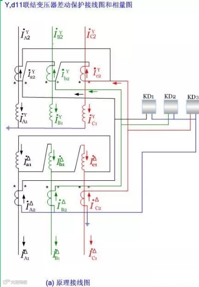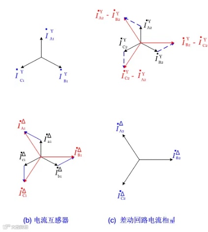 如变压器为Y,d11接线其相位补偿的方法是将变压器星形侧的电流互感器接成三角形,将变压器三角形侧的电流互感器接成星形,如图8-10(a)所示,以补偿30°的相位差。图8-10(b)为星形侧的一次电流和三角形侧的一次电流,及其相位关系。采用相位补偿接线后,变压器星形侧电流互感器二次回路侧差动臂中的电流分别为(右上图红色),它们刚好与三角形侧电流互感器二次回路中的电流同相位,如图8-10(c)所示。这样,差动回路中两侧的电流的相位相同。