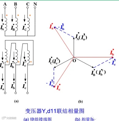 电力系统中变压器常采用Y,d11接线方式,因此,变压器两侧电流的相位差为30°,如下图所示,Y侧电流滞后△侧电流30°,若两侧的电流互感器采用相同的接线方式,则两侧对应相的二次电流也相差30°左右,从而产生很大的不平衡电流。