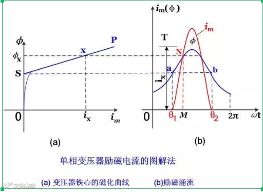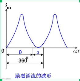 ①励磁电流数值很大,并含有明显的非周期分量,使励磁电流波形明显偏于时间轴的一侧。