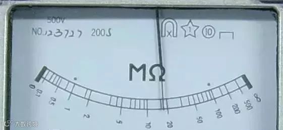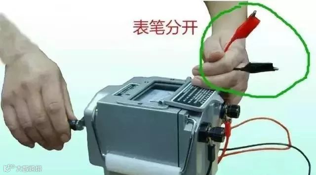 【开路试验】在摇表未接通被测电阻之前,摇动手柄使发电机达到120r/min的额定转速,观察指针是否指在标度尺“∞”的位置。