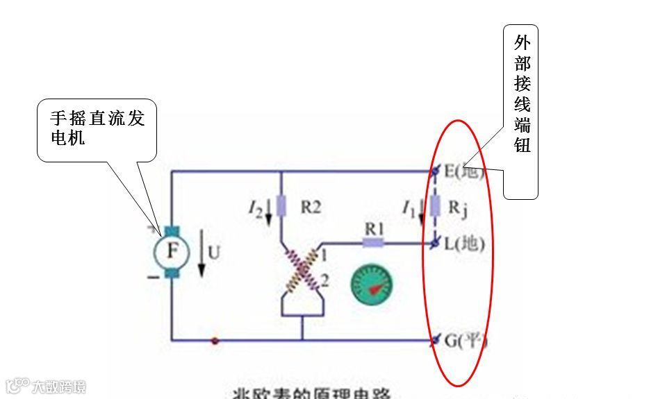 摇表由一个手摇发电机、表头和三个接线柱(即l:线路端、e:接地端、g:屏蔽端)组成。