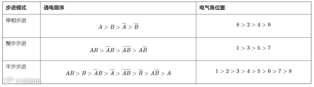 双极性步进电机具有三种控制模式:单相步进、整步步进和半步步进(见表1)。