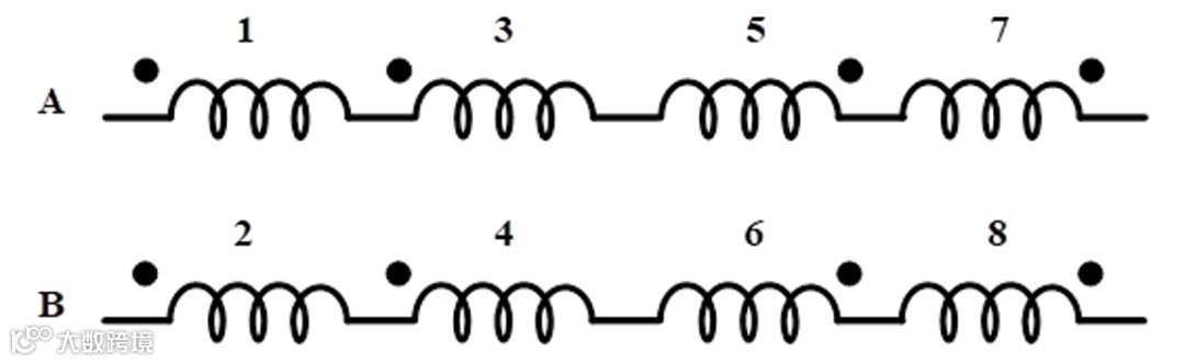 A相绕组绕线从定子1开始绕,依次绕到定子3,5,7上(见图2)。值得注意的是,定子1和5的绕线方向相同,而定子3和7的绕线方向相同。这两组(定子1和5,以及定子3和7)的绕线方向相反。B相绕组也是以同样的原理进行绕制,其中定子4和8为一组,定子2和6为一组。