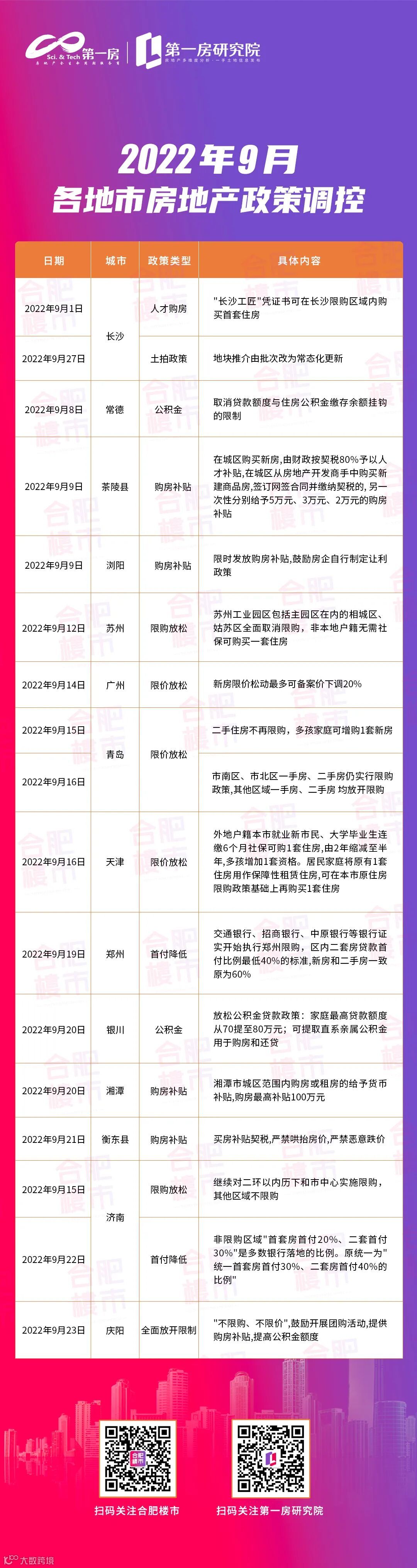 9月各地方政府结合城市自身情况“因城施策”,出台促进房地产市场平稳健康发展相关政策。政策主要以购房补贴、限购放松、公积金贷款利率下调、人才引进、首付降低等调控为主,紧跟中央宏观调控步伐。同时,部分城市也对土拍市场政策做了一定的调整,例如长沙的集中供地改为常态化更新,合肥土拍市场要求三批次出让的土地毛坯交付等。一系列调整都是以“稳”为主。