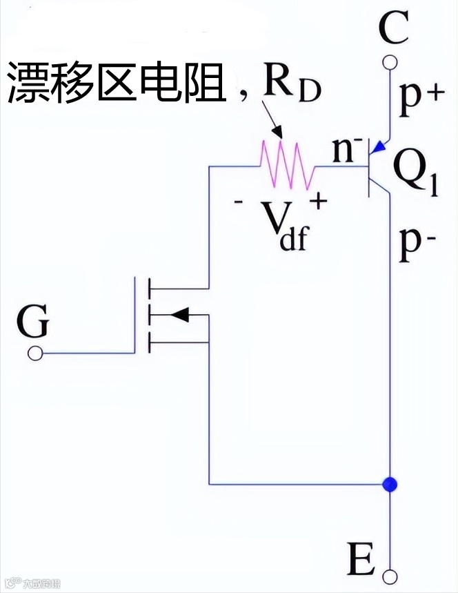 众所周知,IGBT是 MOS 管的输入和 BJT 的输出的组合,它具有与N沟道MOS管和达林顿配置的PNP BJT等效的结构,因此也可以加入漂移区的电阻。