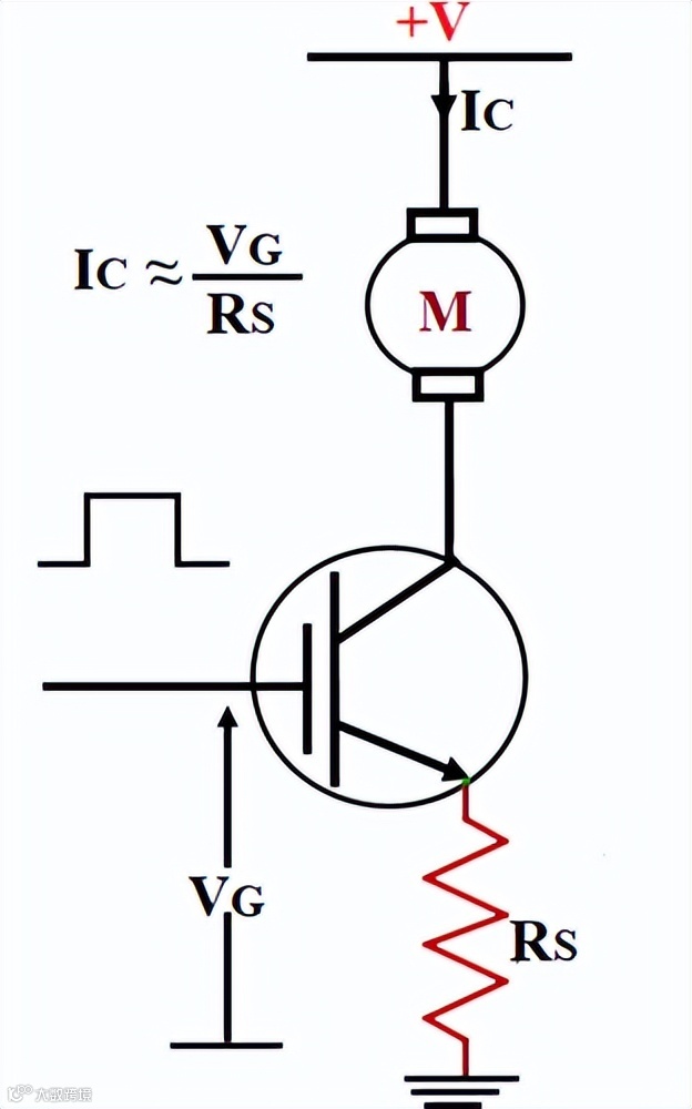 由于是单向器件, IGBT 只能在从集电极到发射极的正向切换电流。IGBT的典型开 关电路如下所示,栅极电压 VG施加到栅极引脚以从电源电压 V+ 切换电机 (M)。电阻 Rs 大致用于限制通过电机的电流。