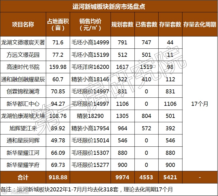从新房市场来看,截止8月底,运河新城板块待售存量5421套,按2022年1-7月月均去化318套计算,理论去化周期17个月。若新地块成交,板块市场竞争将进一步加剧。供求决定价格上涨空间,存量过大只会使得板块价格后劲不足。