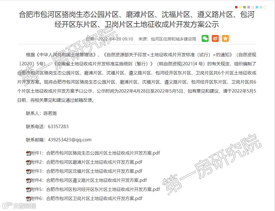 2022年包河区政府公示了一批土地征收成片开发方案,包含了包河骆岗生态公园片区、磨滩片区、沈福片区、遵义路片区、包河经开区东片区、卫岗片区。