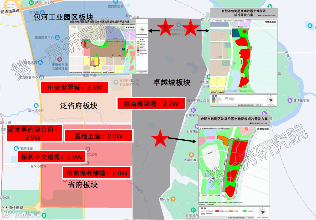 磨滩片区和沈福片区均定位为商业商务、综合服务功能、绿地休闲,届时将与东大圩旅游品牌联动,打造“最美都市田园样板区”,而包河经开区东片区则定位为住宅用地、商业商务、教育及部分工业产业基地,此三大片区均位于卓越城板块,周边板块在售项目因配套差距,2-3W都有。