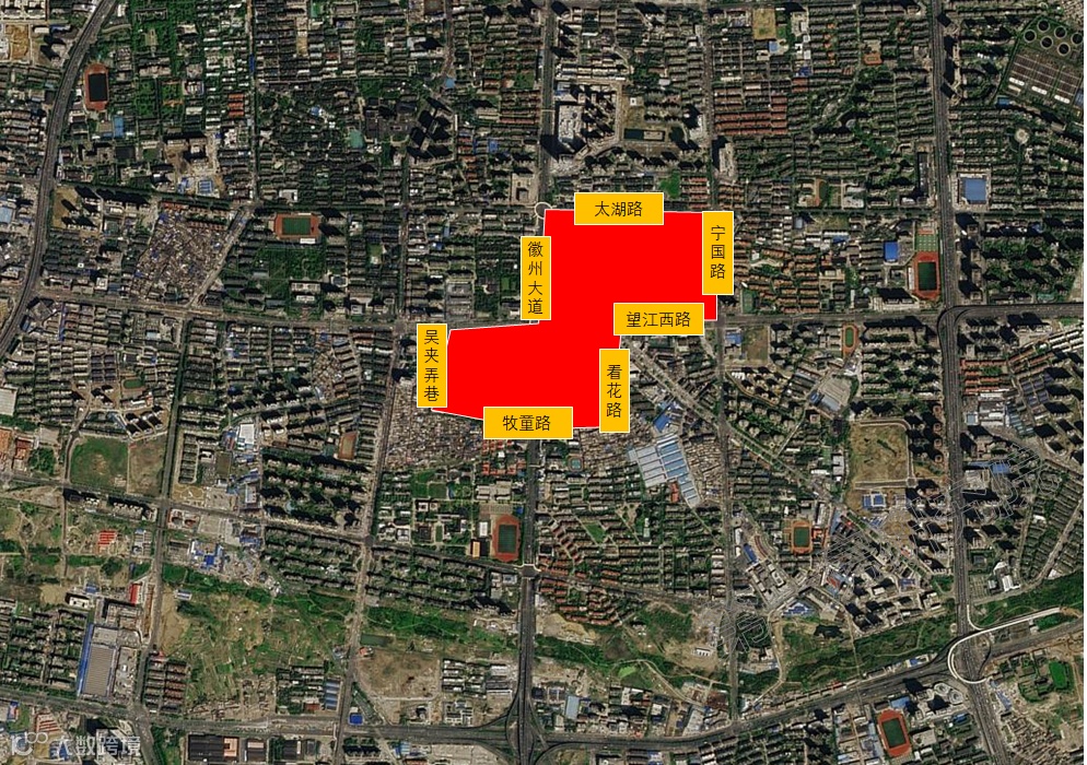 卫岗片区位于包河区北部,东至宁国路,南至牧童路,西至夹衖巷,北至太湖路;涉及同安街道卫岗社区、朱岗社区、芜湖路街道望江东路社区、包公街道炳辉社区。土地总面积 56公顷,拟征收土地面积5.6公顷