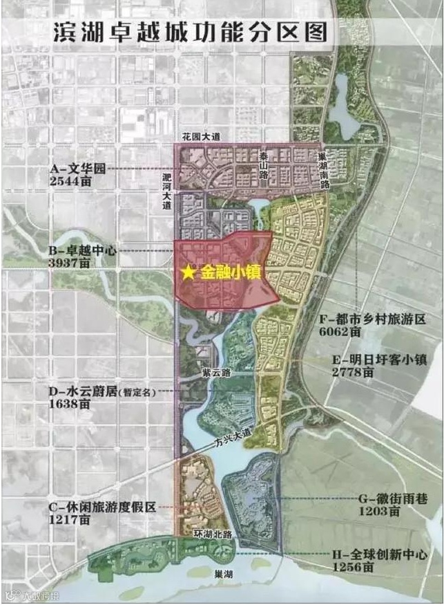 滨湖5.0(也就是卓越城板块)位于包河区东南部,规划设计范围为东至圩西河、南至巢湖大道、西至重庆路、北至花园大道,总面积14.62平方公里。根据规划,空间布局“一轴八区”,包括中央水轴、文华园、卓越中心、休闲旅游度假区、全球创新中心、都市乡村旅游区等。