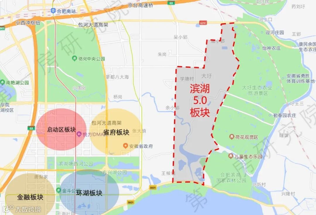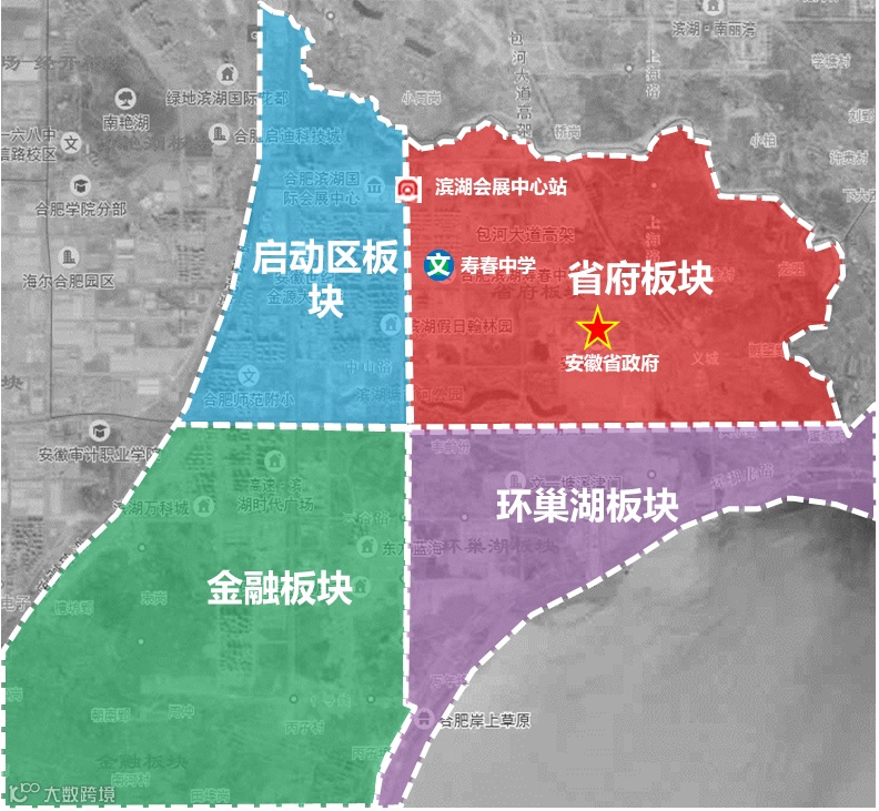 金融板块:合肥国际金融后台基地,中高端金融产业人口近20万,轨交L1和在建L5双地铁加持,由北向南开发,已拓展近南部边界,品牌房企集聚,居住用地稀缺。