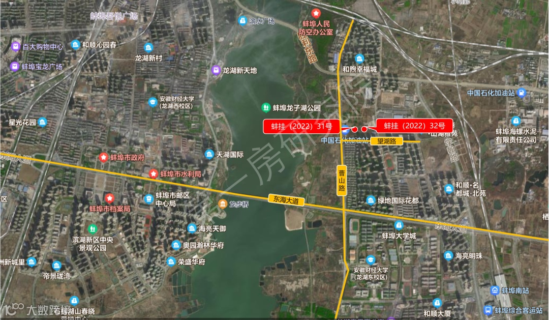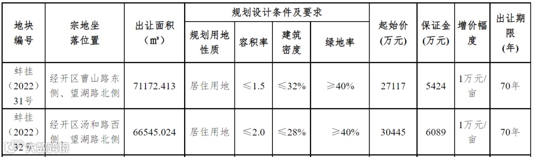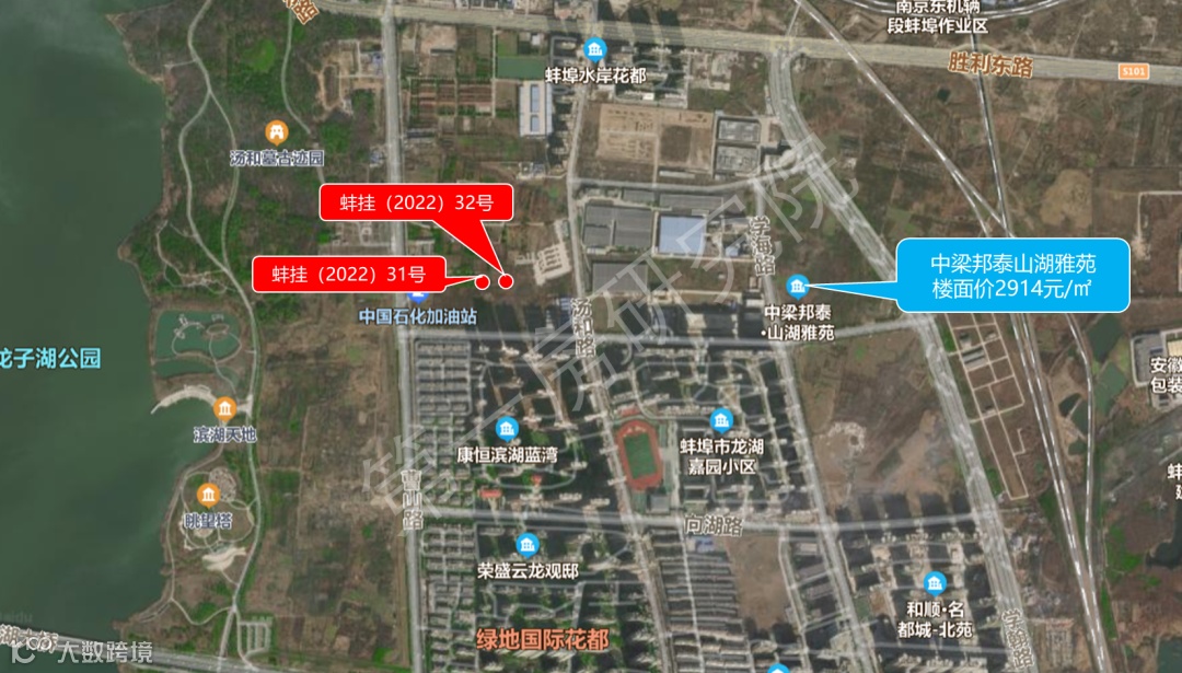 两宗地均位于蚌埠经开区龙子湖东侧,其中(2022)31号地块占地约106.76亩,容积率1.5,起始价27117万元,起拍单价254万/亩,起拍楼面价2540元/㎡;(2022)32号地块占地约99.82亩,容积率2.0,起始价30445万元,起拍单价305万/亩,起拍楼面价2288元/㎡。