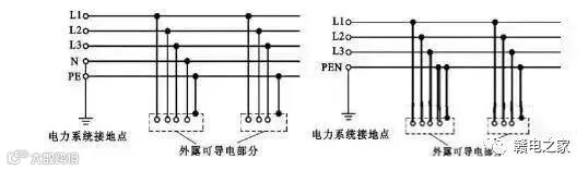 TN-C系统:是指在整个系统中,中性线与保护线是合一的,称为PEN线,即保护接零系统,俗称三相四线制。