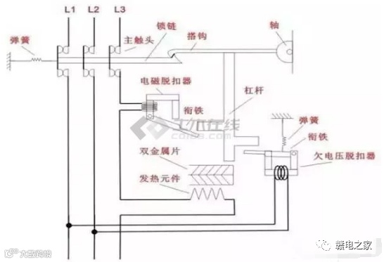 当线路发生一般性过载时,过载电流虽不能使电磁脱扣器动作,但能使热元件产生一定热量,促使双金属片受热向上弯曲,推动杠杆使搭钩与锁扣脱开,将主触头分断,切断电源。当线路发生短路或严重过载电流时,短路电流超过瞬时脱扣整定电流值,电磁脱扣器产生足够大的吸力,将衔铁吸合并撞击杠杆,使搭钩绕转轴座向上转动与锁扣脱开,锁扣在反力弹簧的作用下将三副主触头分断,切断电源。
