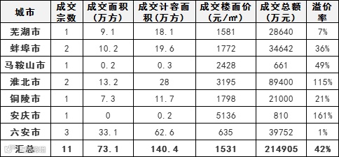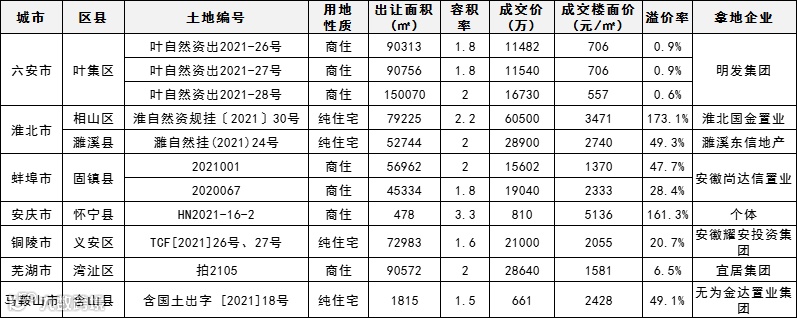 安徽省上周成交的多为县城地块,且多为城市边缘宗地,无重点涉宅用地成交。