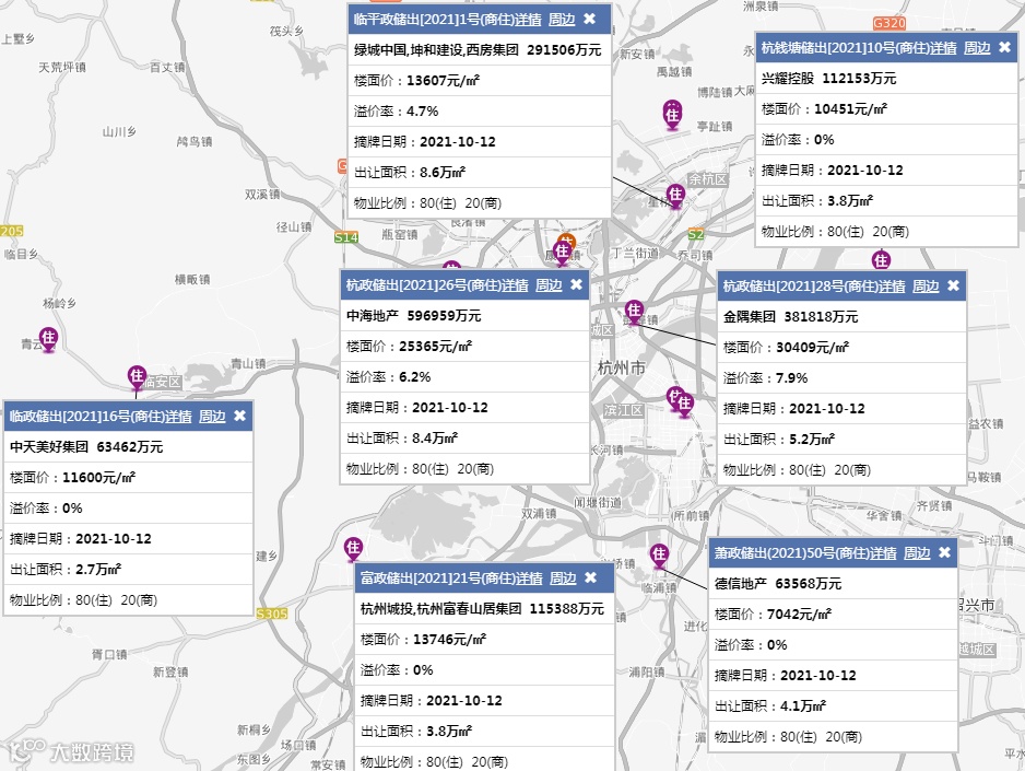 杭州市:杭政储出[2021]26号[商住、8.405万方(126.1亩)] 中海地产59.696亿元(4734.9万元/亩),溢价:6.2%,楼面价:25365元/㎡,1.0<容积率≤2.8