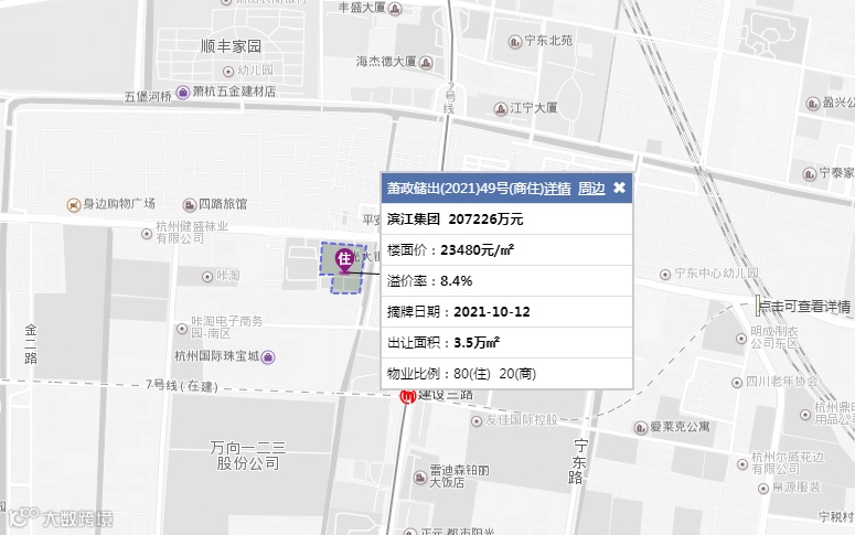 杭州市:萧政储出(2021)49号[商住、3.530万方(53.0亩)] 滨江集团20.723亿元(3913.3万元/亩),溢价:8.4%,楼面价:23480元/㎡,1.0<容积率≤2.5