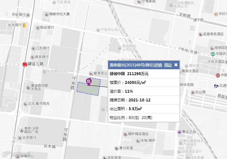 杭州市:萧政储出[2021]48号[商住、3.513万方(52.7亩)] 绿城中国21.130亿元(4009.7万元/亩),溢价:11.0%,楼面价:24058元/㎡,1.0<容积率≤2.5
