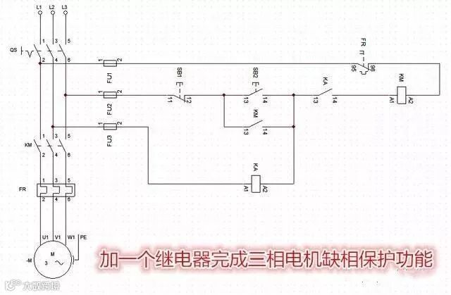 那么有没有一种比较简单、实用,又可靠的,而且适合在普通的三相电动机起停保护电路中,安装的三相电动机缺相保护控制电路呢。大家来看看下面这张三相电动机缺相保护控制线路图怎么样,这是我以前收藏下来的最喜欢的一张简单可靠的三相电动机缺相保护控制线路图。