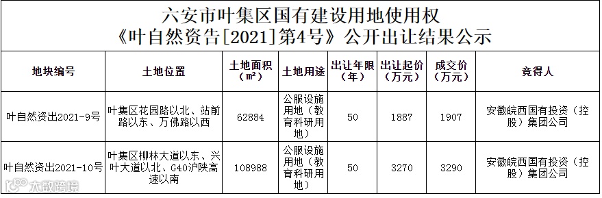 六安市叶集区2宗教育科研用地使用权由安徽皖西国有投资(控股)集团公司成功竞得。