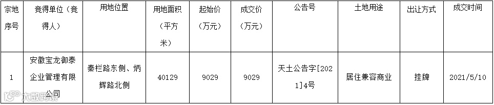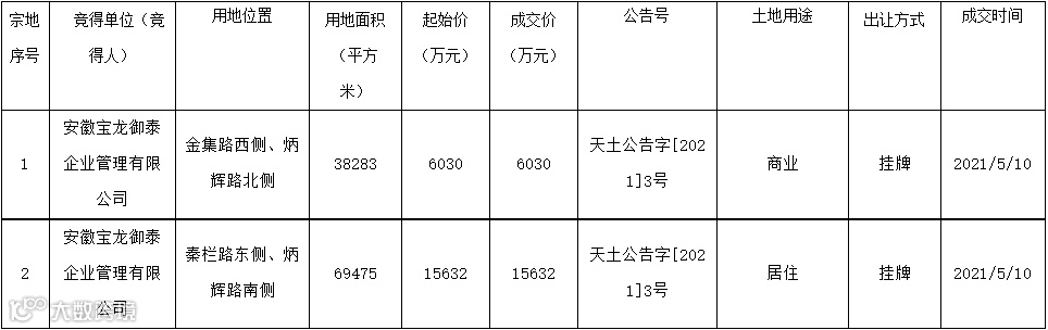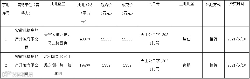 滁州市天长市5宗土地使用权成功出让,3宗竞得者为安徽宝龙御泰企业管理有限公司,另外2宗是安徽兆福房地产开发有限公司。