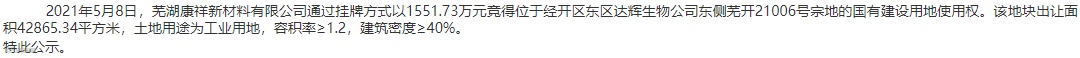 芜湖市经开区2宗工业用地使用权分别由芜湖银湖实业有限公司和芜湖康祥新材料有限公司竞得。