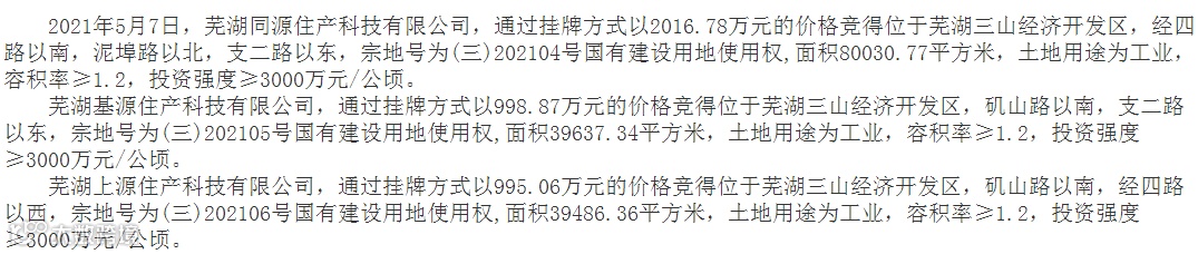 芜湖市8宗土地使用权成功出让,三山经开区3宗工业用地使用权分别由芜湖同源住产科技有限公司、芜湖基源住产科技有限公司、芜湖上源住产科技有限公司。