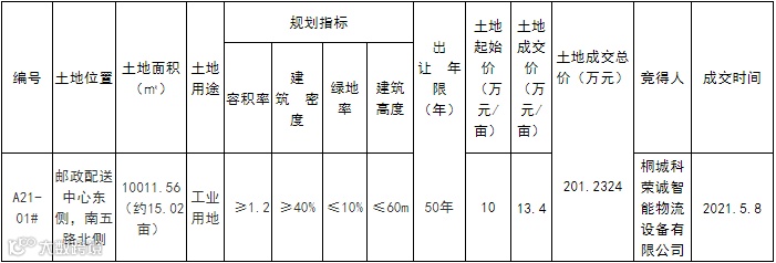 桐城市5宗工业用地使用权分别由桐城科荣诚智能物流设备有限公司、安庆汇通汽车部件股份有限公司、安徽创想焊业有限公司、安徽尚尚家纺有限公司桐城市祥锦包装有限公司竞得。