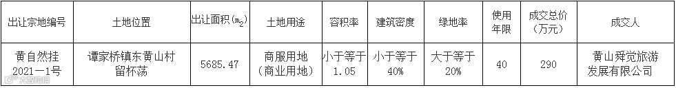 黄山市黄山区谭家桥镇东黄山村留杯荡黄自然挂2021—1号地块使用权由黄山舜觉旅游发展有限公司竞得,规划用途为商服用地(商业用地)。