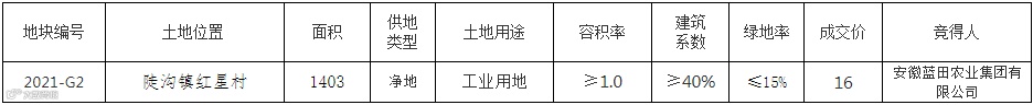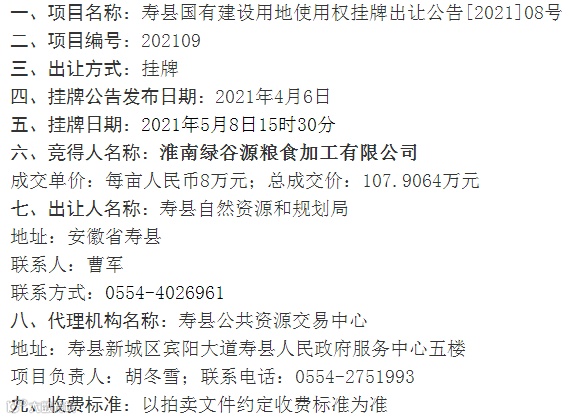 淮南市寿县小甸镇李山村部以南,村级道路西侧,李山中学西南侧202109号地块使用权由淮南绿谷源粮食加工有限公司竞得,规划用途为工业用地。